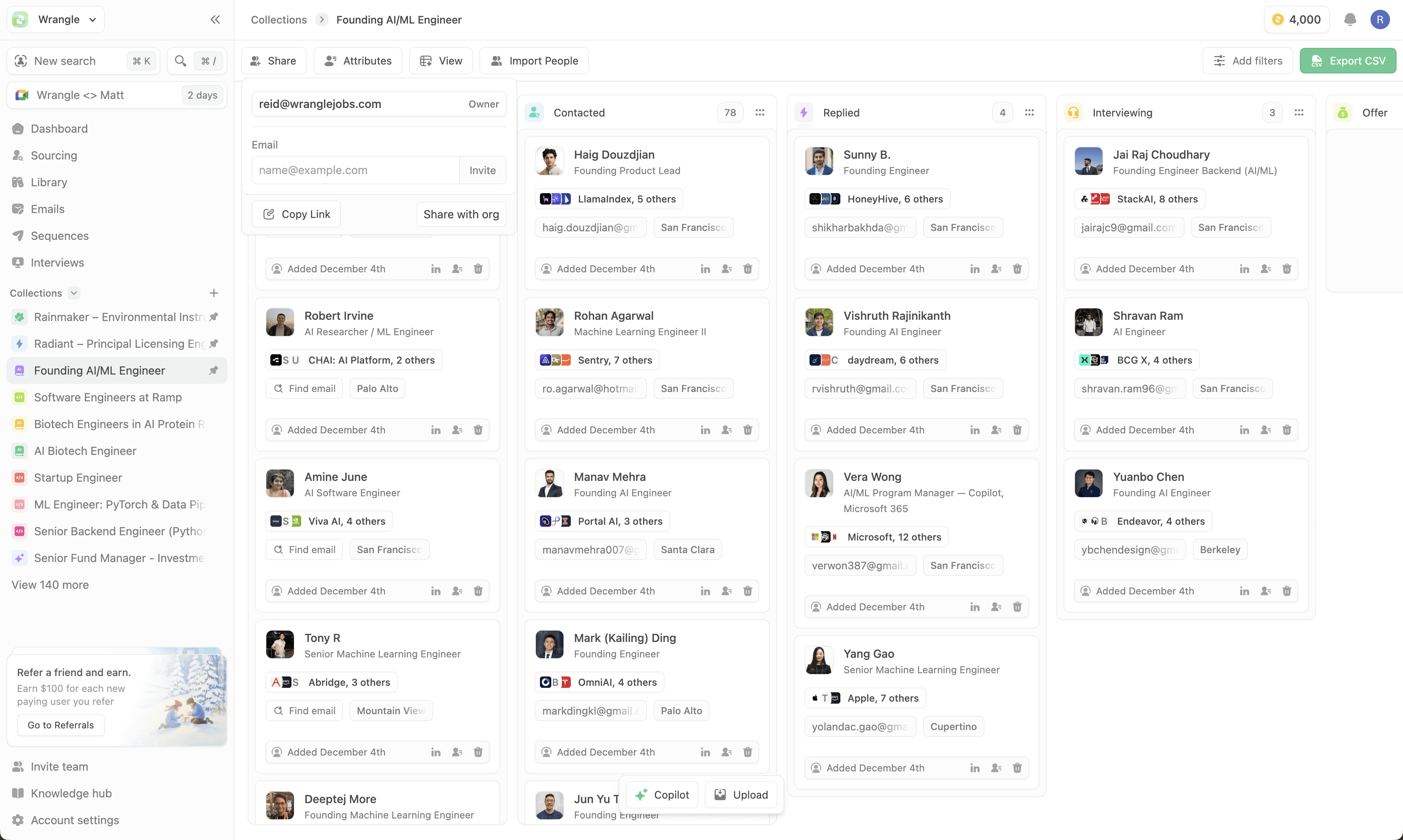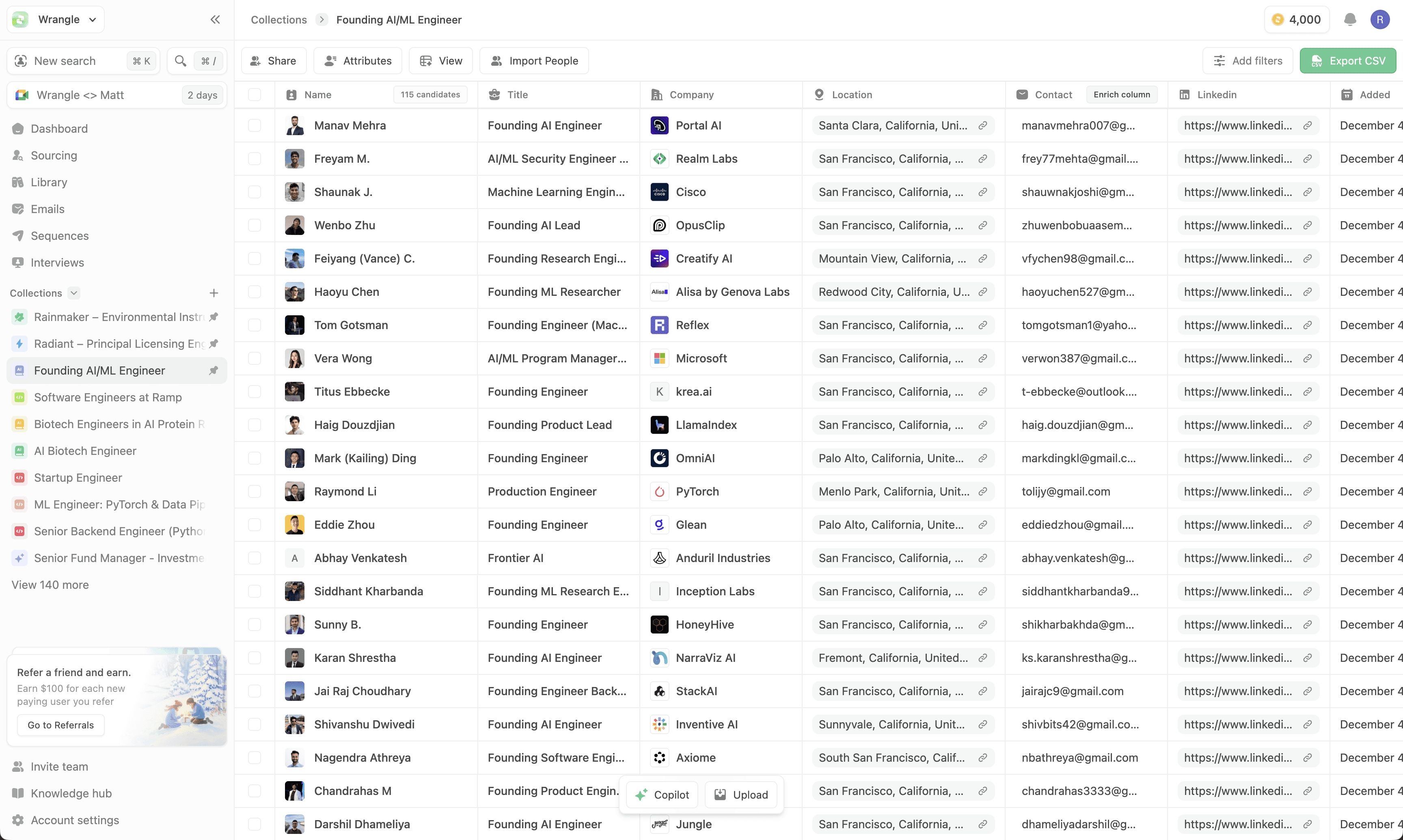 Upload a CSV with custom candidates. Wrangle will automatically enrich those profiles.